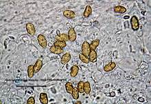 Tabakbraun (8-12 x 5-7 µm, Zystiden ungewöhnlich geformt; oft