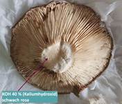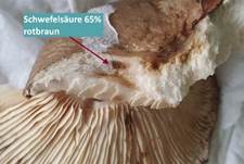Fleisch mit Schwefelsäure 65 % rotbraun, KOH schwach rosa. |