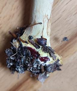 der Stielspitze. Jung gelbliches Velum am Knollenrand, später bräunlich