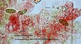 Mit Kalilauge (KOH) im Fruchtfleisch orangerötlich bis intensiv rot. |