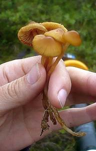 Wie Hut, gelb, orangegelb, bereift, meist verbogen. Basis mit weißem