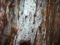der Baumrinde befinden. Dadurch entfärbt er die grüne Farbe der Algen zu