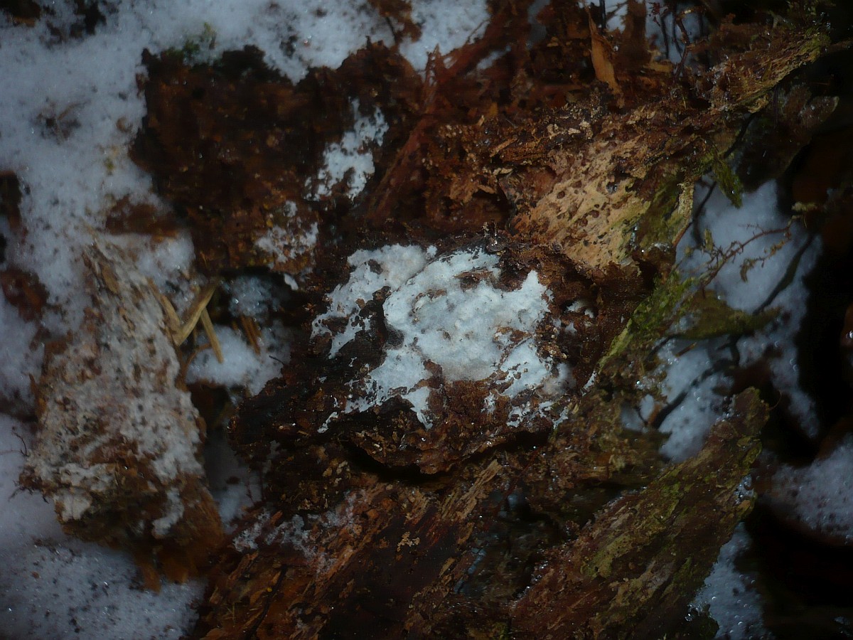 Der Weiße Rindenpilz greift Grünalgen oder/und Flechten an, die sich an