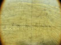 hyalin. Hutdeckschicht mit ca. 5 µm breiten und 65 µm langen zylindrischen