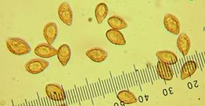 Gelblich-rostbraun (8,5-12 x 1,7-6 µm, mandelförmig, warzig). |