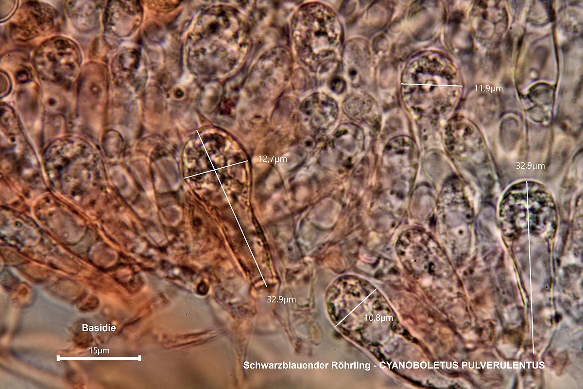 30-35 x 8-11 µm. Zystiden 40-60 x 7-12 µm, meist spindelig, Ende zugespitzt. HDS