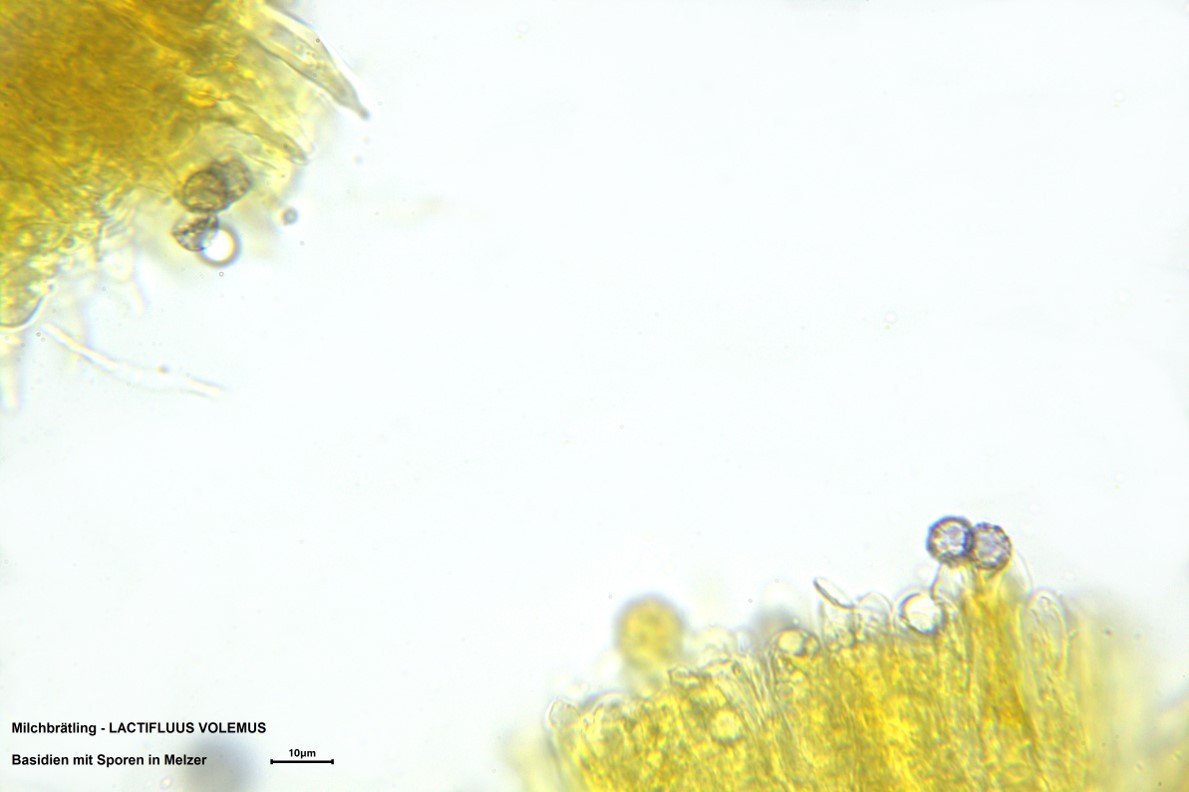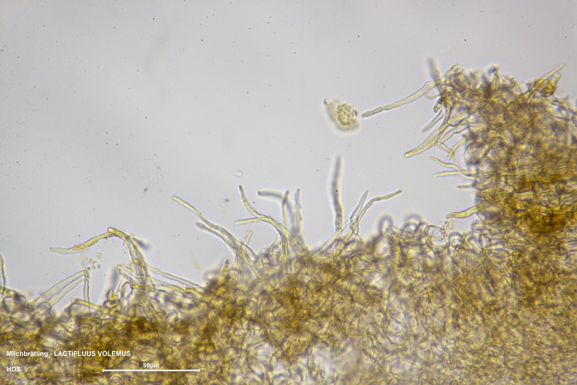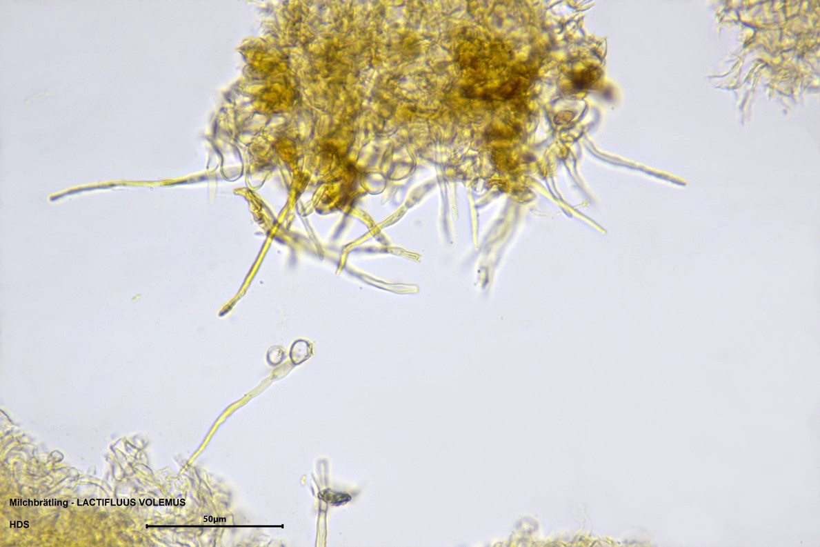 hierzu noch der Dunkelhütige Brätling (LACTARIUS VOLEMUS VAR. OEDEMATOPUS), mit dunkelbraunem Hut und mikroskopisch längeren Huthaaren. Die mikroskopischen