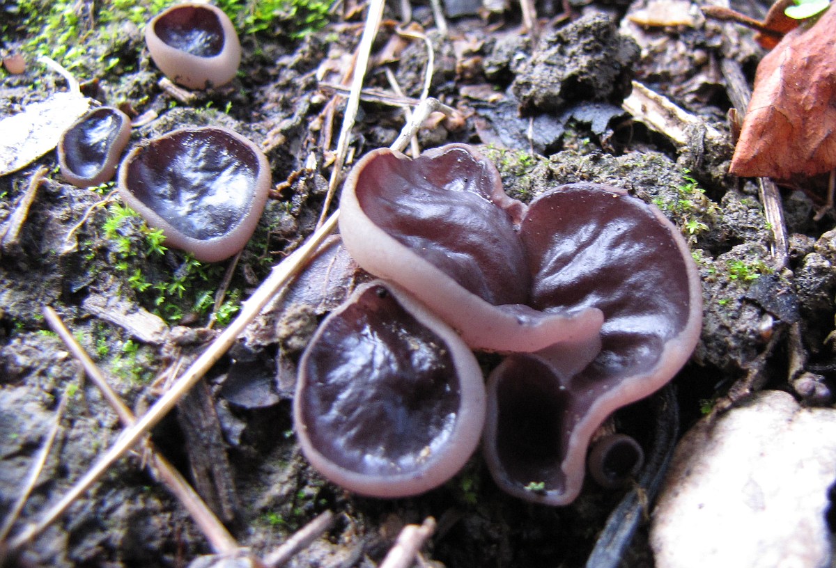 achtsporig). Übersehener Becherling (PEZIZA PRAETERVISA) = überwiegend auf Erde, Scheibe violettrosa, Außenhaut