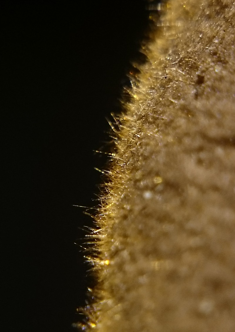Ø, graubraun bis dunkelbraun, mit gold- oder olivfarbenem Tönen, filzig, hellbraun bis rotbraun behaart, braun-borstig,