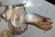 schmäler zugespitzt, Basis mit blauviolett-bräunlichen Velumresten