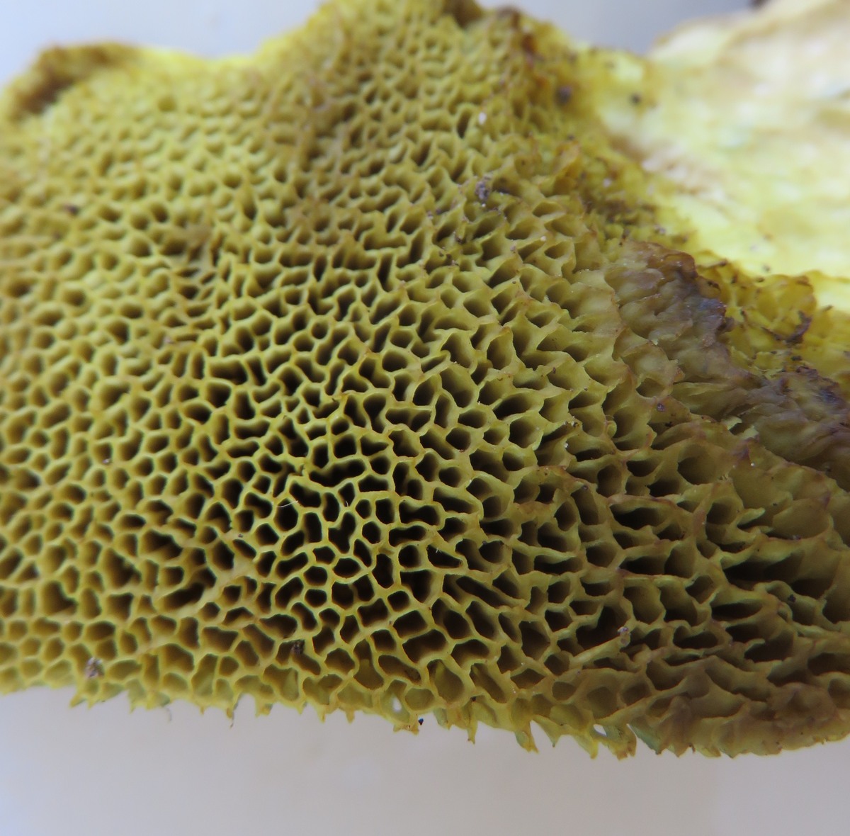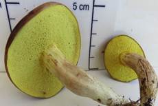goldgelb, alt olivgelb, Röhrenboden gelb, +/- auf Druck leicht blaugrün verfärbend, eckig. |