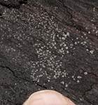 | Fruchtkörper: | 0,2-0,5 (0,8) mm Ø, weiß, grau, blaugrau, olivgrau, Rand verdickt, im Alter wellig,