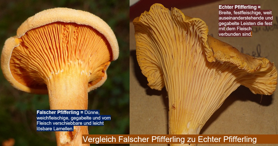 und dunklere, orangerote Farben. Der Falsche Pfifferling ist kein Leistenpilz wie der Pfifferling,