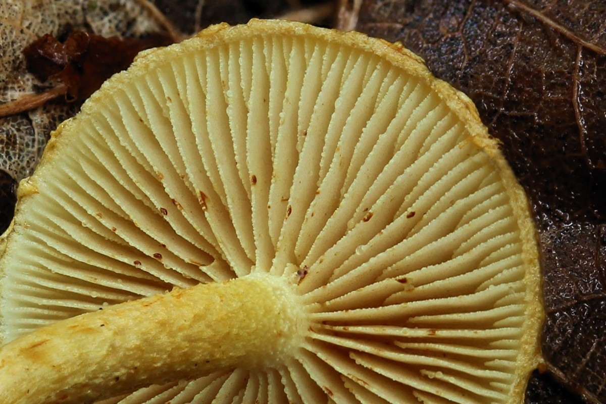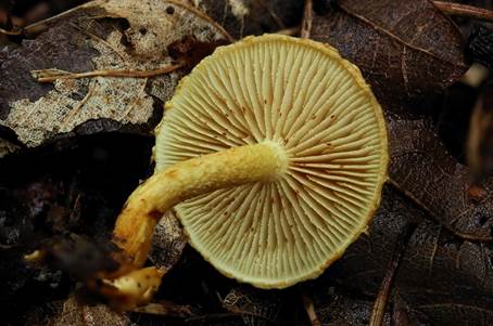 gelb bis orangegelb mit Schüppchen besetzt. Rand gelb bis rotbraun und oft