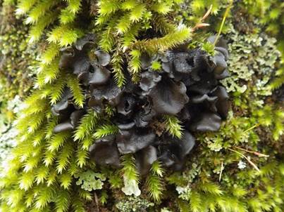 Gallertartiger Thallus bis ca. 8 cm, Lappen 2-10 mm Ø, dunkel schwarz-oliv,