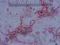 keulenförmig, Spitzen 1-3 µm breit, bis zu sieben Septen. Zum Vergleich: