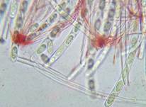 µm, ellipsoid, die Pole sind schwach konkav-abgesenkt, hyalin. Asci 350-450 x 12-15 µm. Paraphysen, zylindrisch,