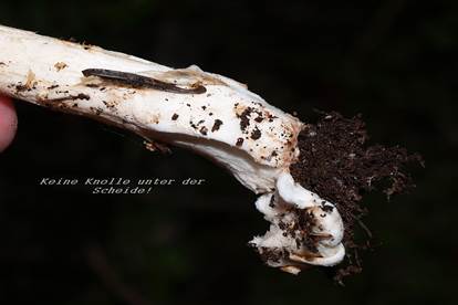 nach oben laufend (Pantherpilz)! Keine Knolle. Unter der Volva/Scheide an der Stielbasis befindet sich