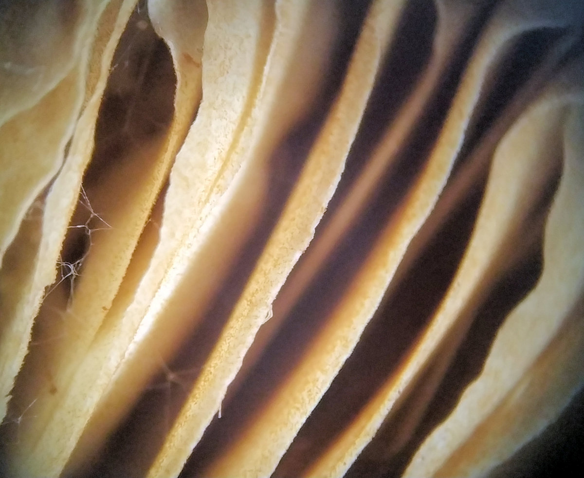 dunkelbraun, niemals goldgelb wie beim Goldmistpilz,