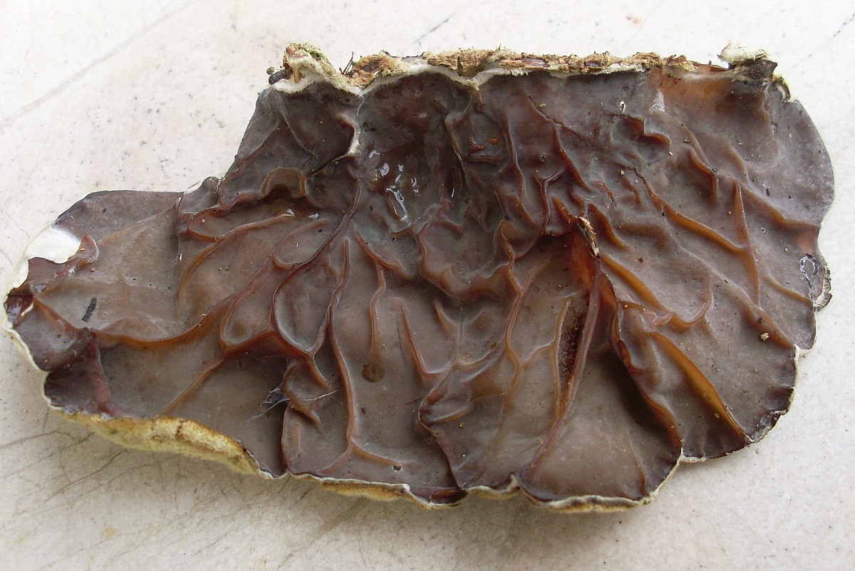 Knorpelschichtpilz, Violetter Lederporling mit deutlichen feinen Röhren an der Unterseite,