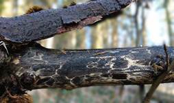 Schichtpilzähnliches Aussehen – Gattung hier Myzel der Holzkeulen. |