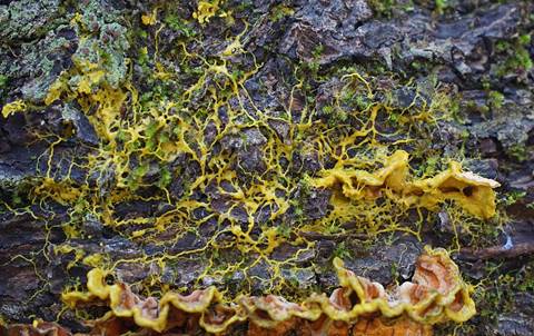 Netzschleimpilz, Gelbe Lohblüte (Hexenbutter), PLASMODIUM von: Fadenfruchtschleimpilz, Gelber Eierschleimpilz, Löwenfrüchtchen, |