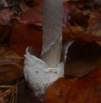 verdickt, niemals knollig, Volva weißlich. Spitze ist leicht vom Hutfleisch