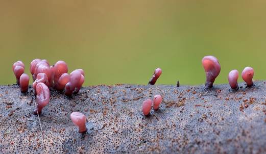 kreisel- bis schalenförmige Apothecien (Fruchtkörper) während der Fleischrote Gallertbecher