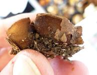 borstiger Außenhaut und hellerer weißlich-gelber Innenhaut (Scheibe),