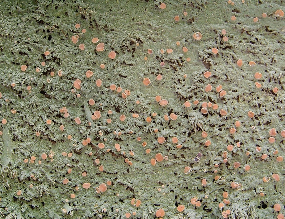 ausgedehntes Lager mit rosa gefärbten becherlingsartige Fruchtkörper
