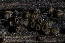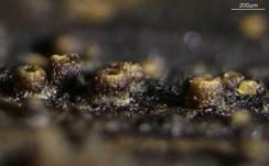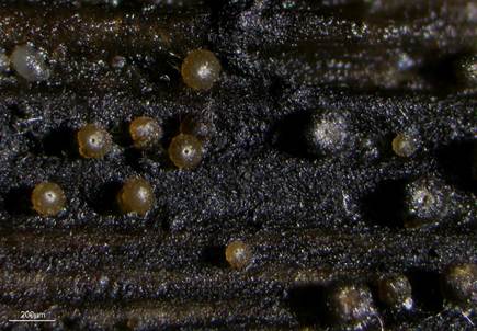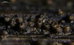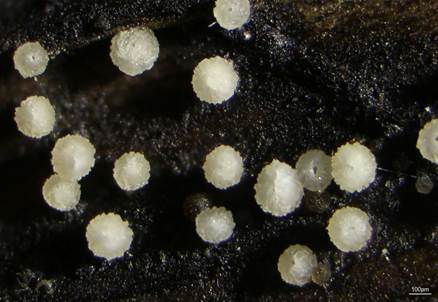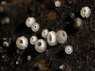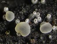 | Fruchtkörper: | 0,4-0,8 (1,1) mm Ø, weiß, grau, blaugrau, olivgrau, braungelb, goldbraun, elastisch,