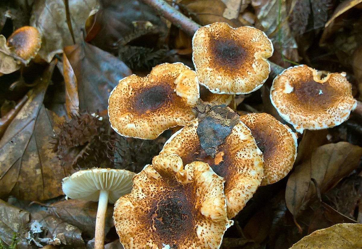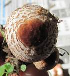 (7) cm Ø, kastanienbraun, mit dunkelbraunen konzentrisch-gezonten Schüppchen auf weißlich bis gelben Grund,