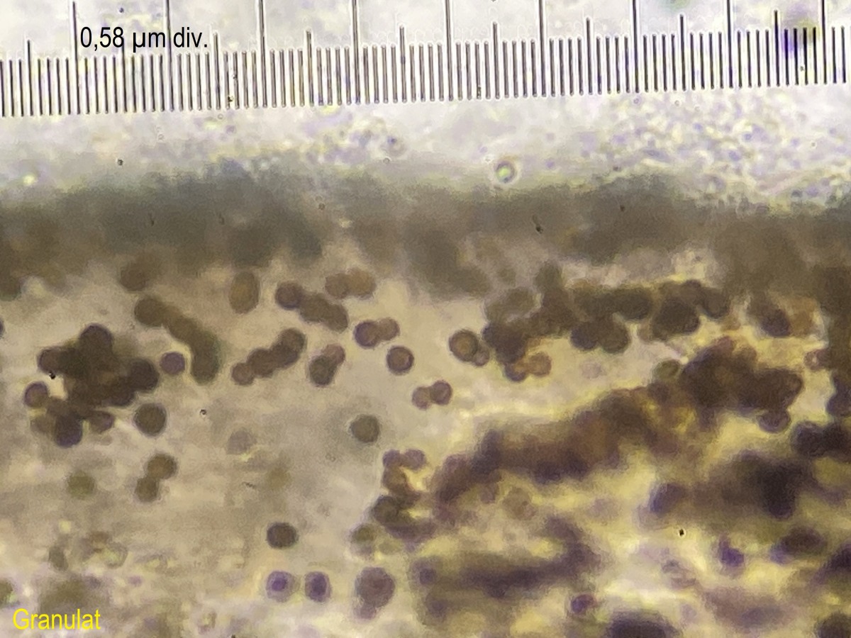 Sporokarpien 0,5-1,8 (2,1) cm Ø, bis 2 mm hoch weißlich grau, blaugrau,