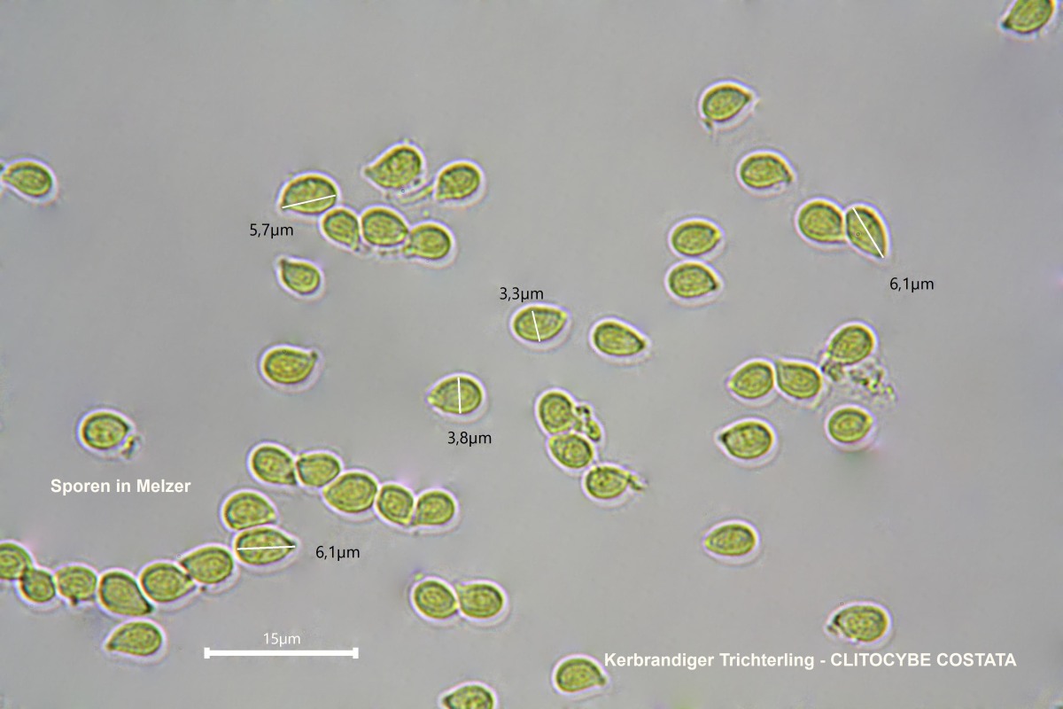 Gelblich-weiß (5,2-9 x 3,5-5 μm, tränenförmig, apikal breit