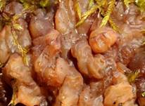 orangebraun, olivbraun bis rotbraun verfärbend, gelatinös, höckerig,