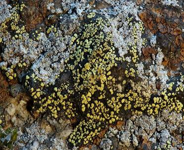 Landkartenflechte, Soredians Blattflechte, Steinflechte, Stern-Schwielenflechte, Feuerflechte. |