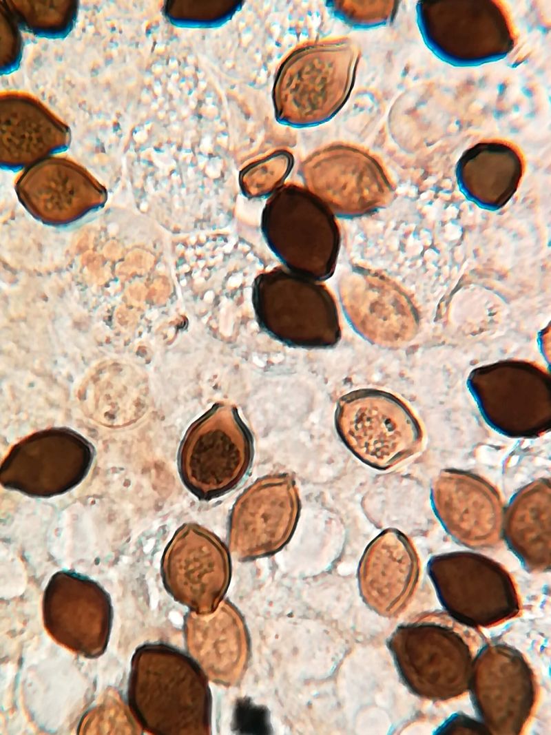 (9,7-14 x 7,6-10,5 µm, oval, ellipsoid, mitraförmig. Basidien 25,8-30,7 x