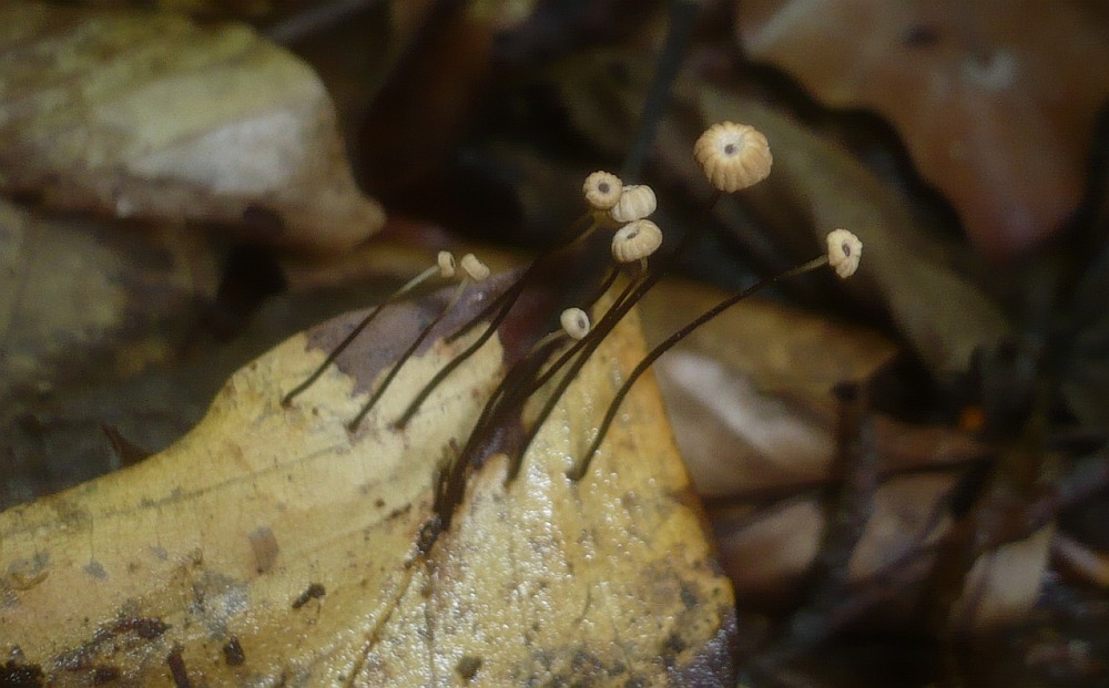 wie bei dem Halsbandschwindling der aber meist auf Ästen wächst, gerne auf Buchenblättern,