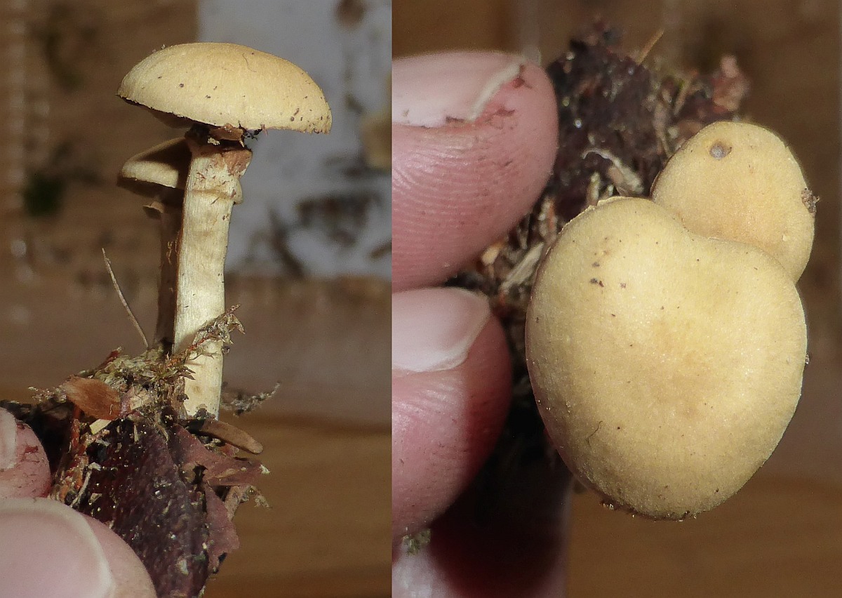 beigebraun bis rötlichbraun, konisch, konvex, kaum deutlich ausgeprägt. Schleier