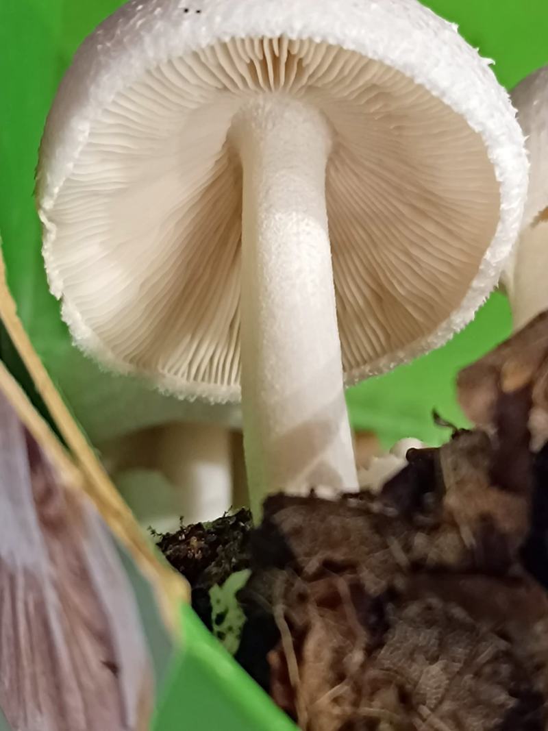 Scheide, später blass lederfarben, fest, rund, faserig, seidig, bereift, Basis verdickt. |