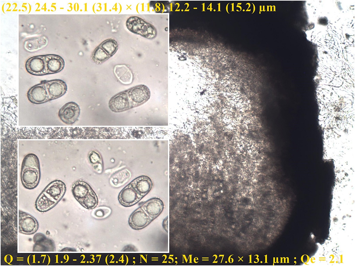 Weiß, farblos (14,5-28,5 x 8-12,5 µm, 2-zellig, Wand verdickt). |