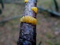 Zitterling und Gelber Schichtpilz-Zitterling (auf Laubholz), Zungenhörnling, Zerfließende Gallertträne,