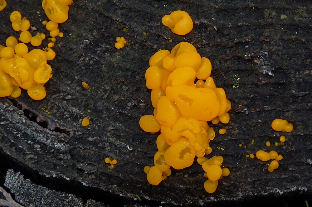0,5-1 (3) cm Ø, gelblich, orangegelblich, gallertartig, kugelig, später