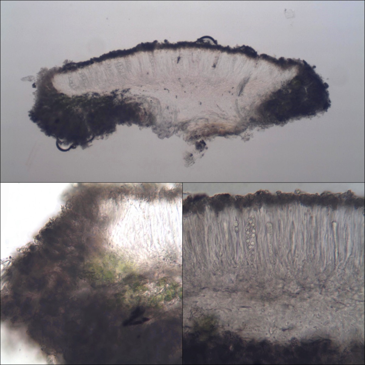 becherlingsartige braune, weißlich bereifte dünne Apothecien (Fruchtkörper)