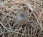 schwärzlichen feinen Schuppen besetzt, Mitte dunkler, leicht buckelig, Rand heller, etwas gilbend. |