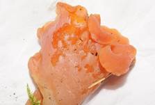 Gallertartig, elastisch fest, weißlich bis hellorange, hellrot. |
