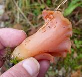 durchscheinend, außen blassrötlich, glatt, kahl, gummiartig, trichterförmig,