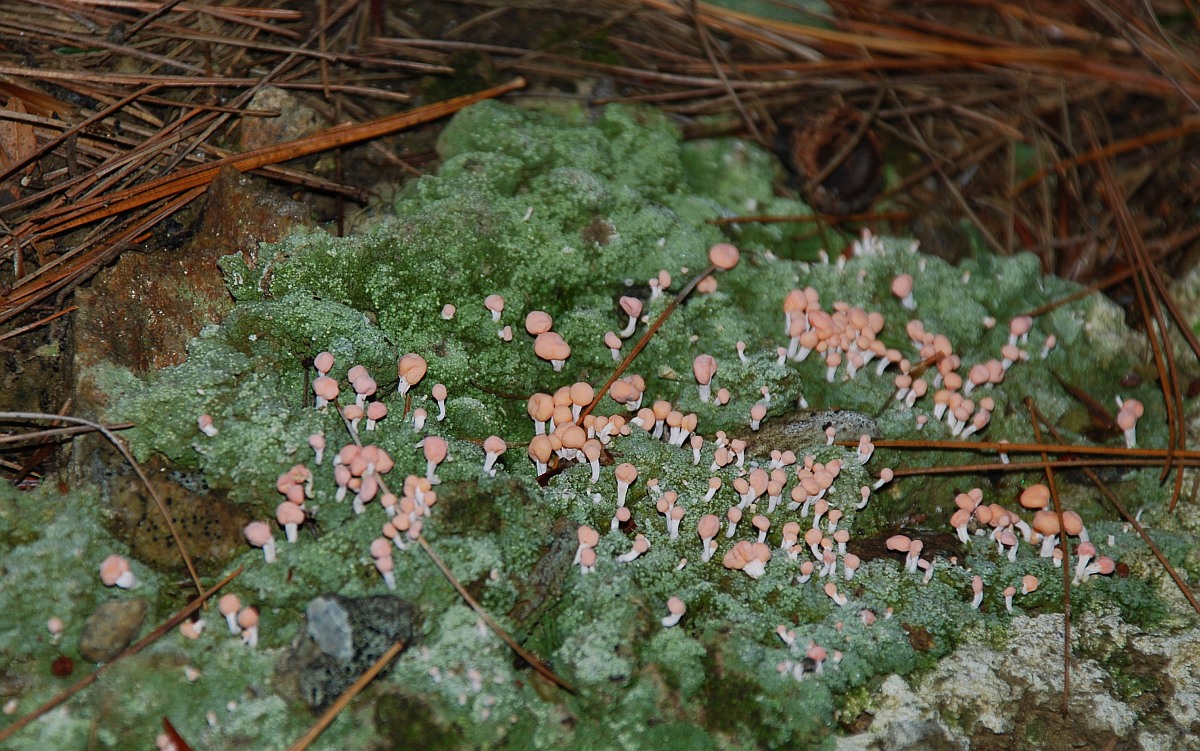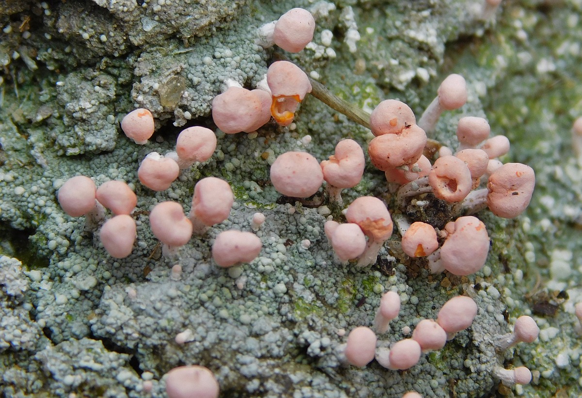Ausgedehntes Lager mit großen (ca. 1-2 mm Ø) gestielten rosa Fruchtkörpern (Apothecien). |
