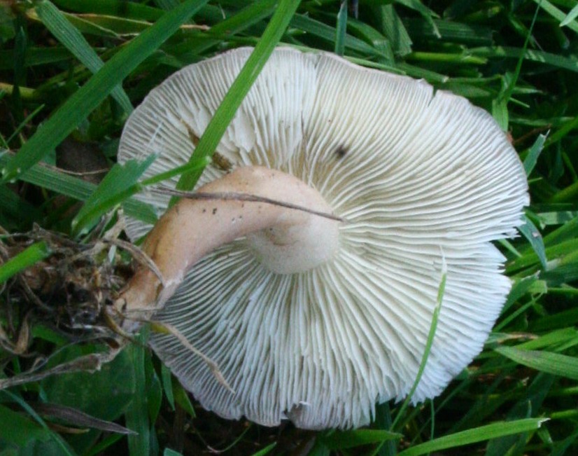 weißlich bereift, bepudert, Stielspitze bzw. Übergang zu den Lamellen