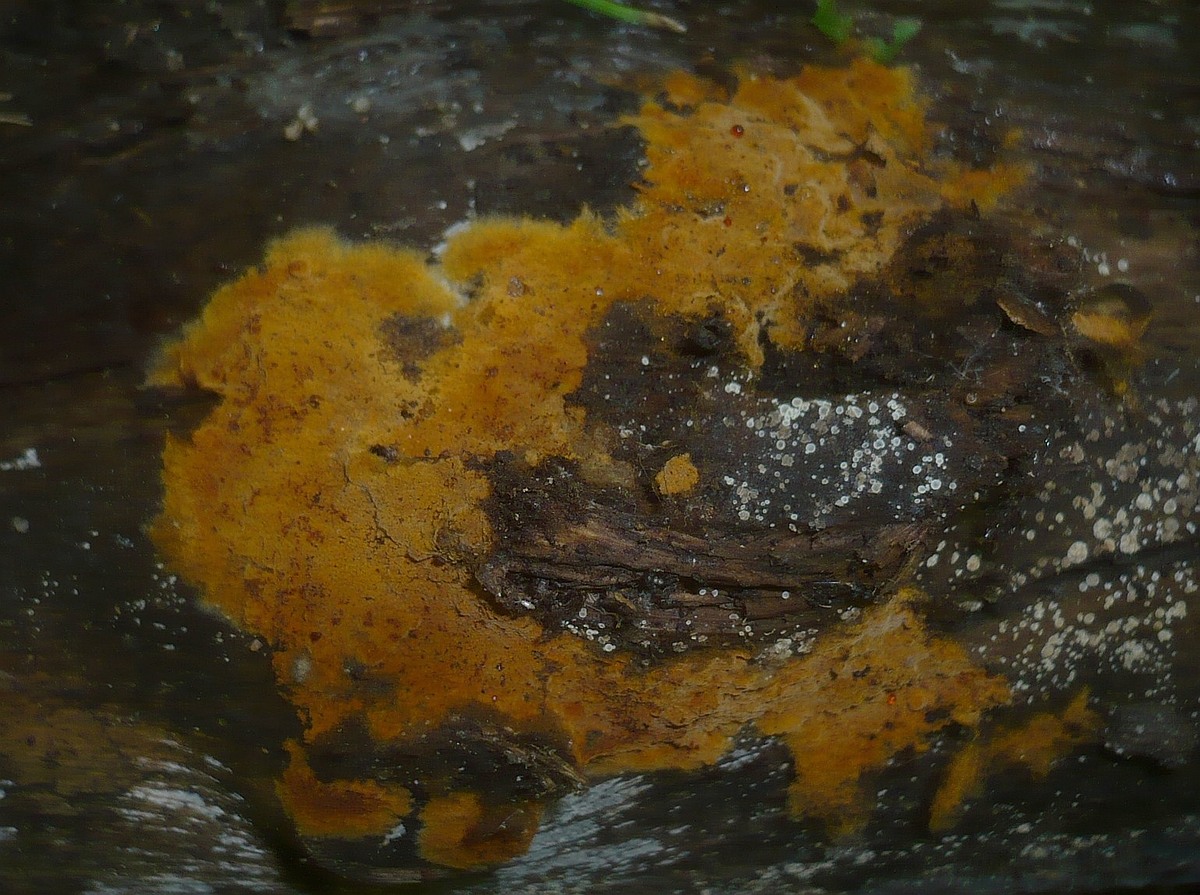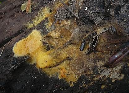 Gitterschleimpilz, Netzschleimpilz, Gelbe Lohblüte (Hexenbutter). |